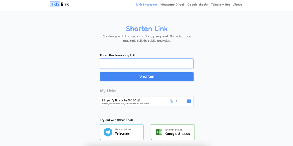 Its a 5 in 1 tool. 1.Link shortener without login/registration 2.Free Analytics 3.Link shortener in google sheets - shorten links in google sheets. 4.Link shortener bot - Shorten links in telegram. 5.