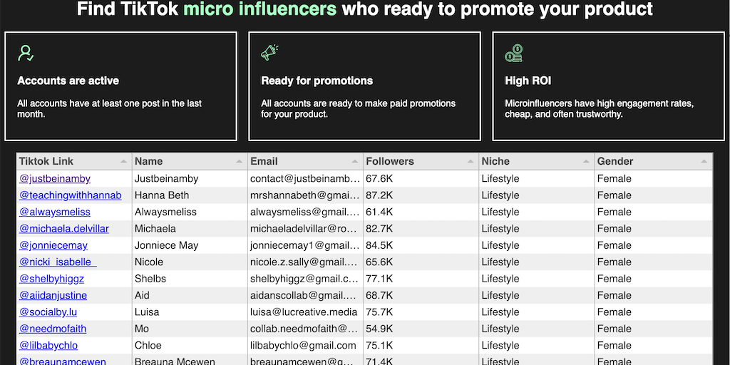 TikTok Micro-influencers list. Super simple and easy to use. All accounts are active, ready to make promotions. More than 300 people already in the list. Any influencer can apply to join the list. We