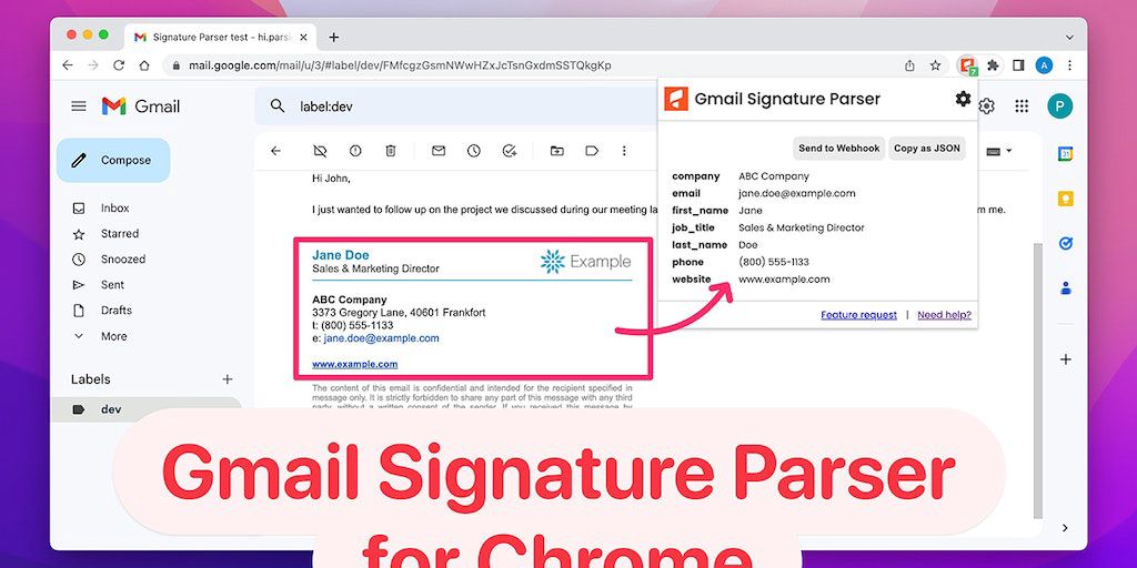 Use ChatGPT to extract structured contact details from Gmail signatures and sends them to Google Sheets, webhooks, Zapier etc. The extension extracts the following contact details from Gmail signature