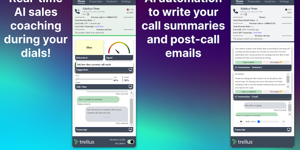 Book more meetings on your cold calls with help from Trellus' AI assistant. Trellus gives you real-time suggestions on what to say to get a prospect to agree to a meeting while automating all your pos