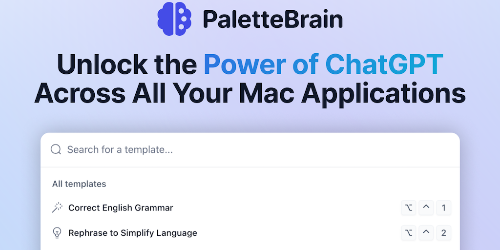 PaletteBrain is a macOS application that lets you use ChatGPT with any application by using a shortcut. Create custom templates with your own shortcuts or use the default templates provided.