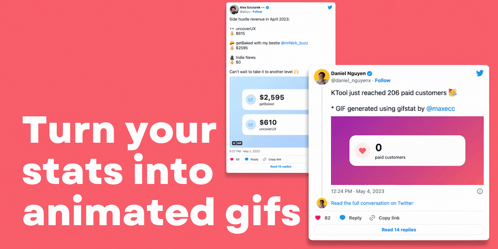 Create custom, animated GIFs to share your #buildinpublic achievements in an engaging way. Gifstat currently offers count-up animations - but will soon support additional features such as animated gra