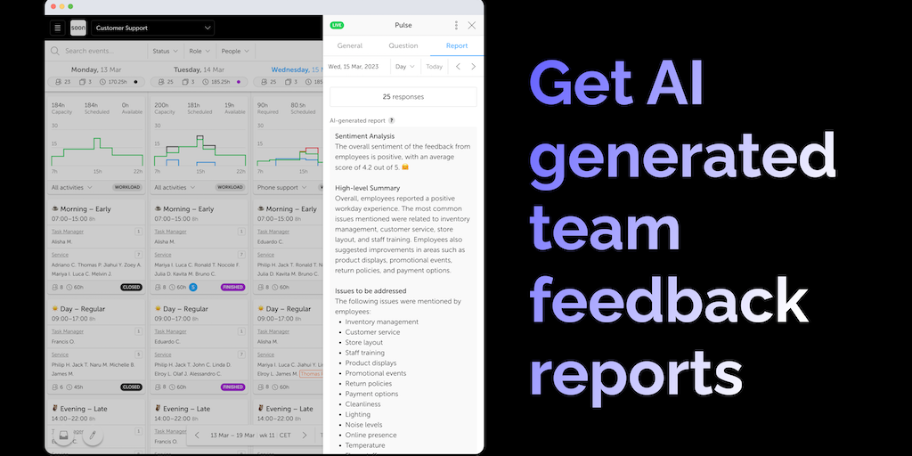 Get AI-powered employee feedback and real-time insights to optimize your business operations, boost team performance, and increase employee engagement with Soon Pulse. Identify improvement areas and g