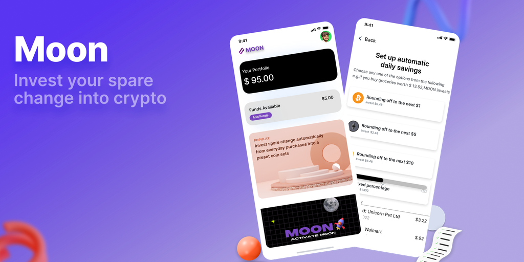 Moon invests spare change automatically from everyday purchases into a crypto coin set based on pre-set risk/reward profiles which compound over the years and go to the moon over the period.
