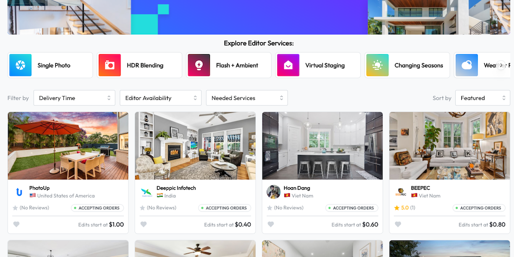 Pixlmob is an online marketplace built for real estate photo editing. Photographers can browse verified editor profiles and see services, turnaround times, portfolios, and reviews. Pixlmob houses the