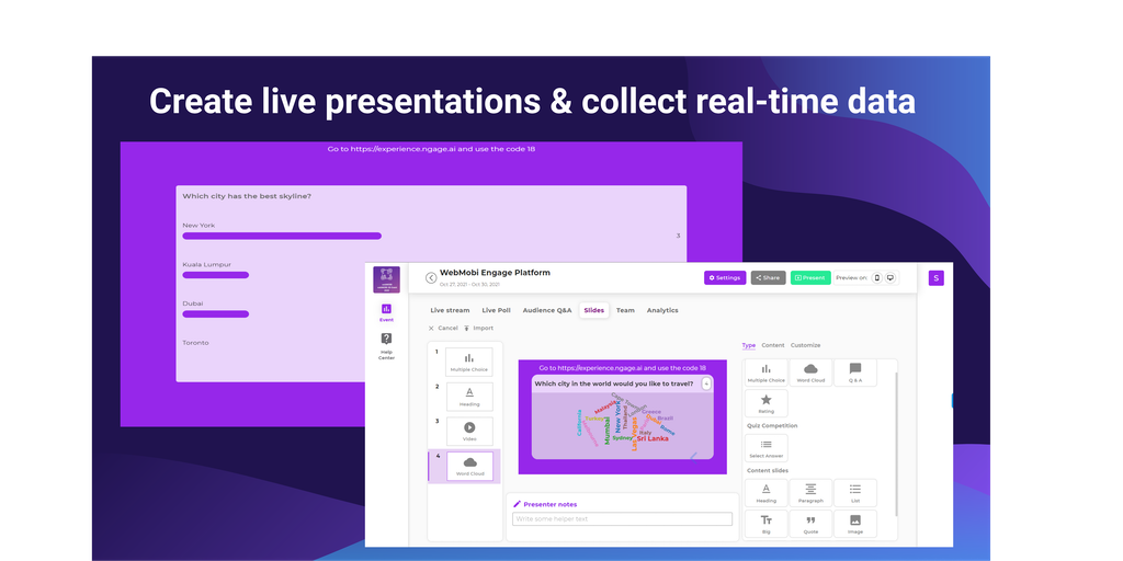 Engage audiences for meetings & events throughout the year with live presentations, live polls, quizzes, Q & A, and word cloud. Build interactive slides with the easy-to-use online editor. Add live st