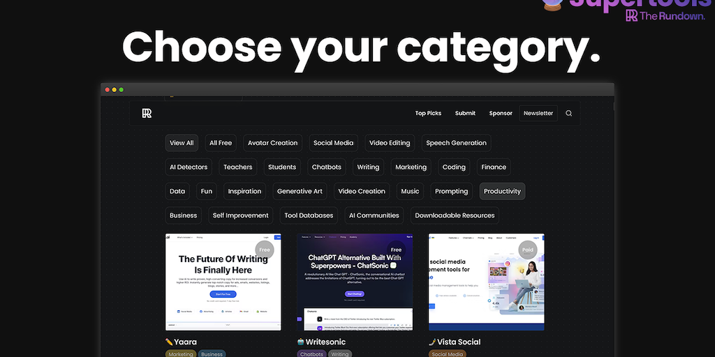 Supertools makes it easy to find the perfect AI tool for any task. Track and organize the best tools all in one spot. Choose your category, browse top picks, or submit your tool to get featured. 100%