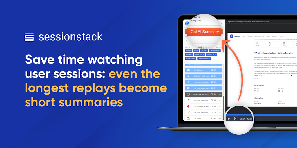 SessionStack just got its own AI capability to condense session replays into short summaries! Now you have visibility of your users’ experiences in less time, paired with UX tips for better adoption a