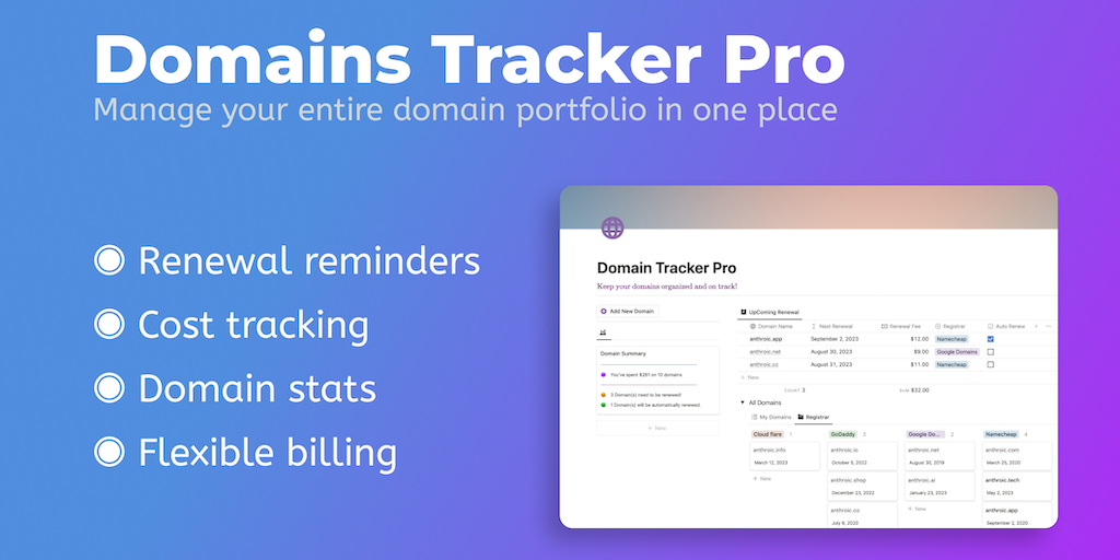 The Domain Tracker Suite offers tailored solutions for effortless domain management.Core features include timely renewal reminders, detailed domain statistics, cost tracking, flexible registration ter