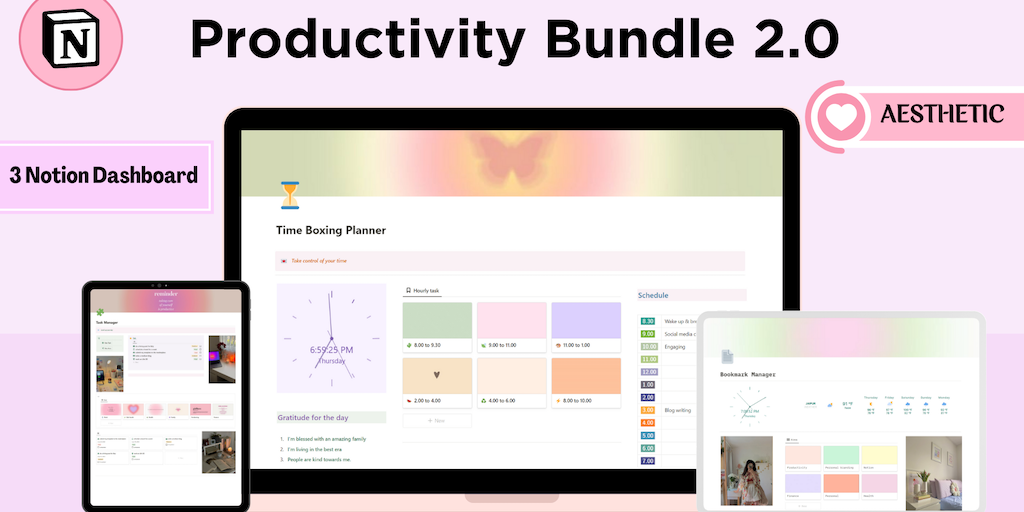 This pastel theme Productivity Bundle 2.0 is the perfect template for you to manage your life. In this template, you'll get combine of 3 templates. - Task manager - Timeboxing planner - Bookmark manag