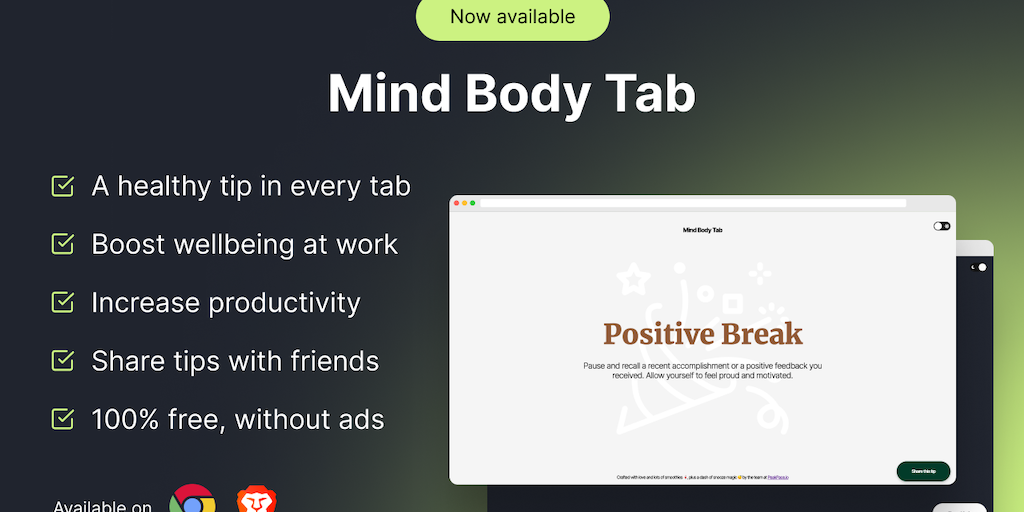 Each new tab provides a fresh prompt to help you feel energised and ready to tackle the day. Whether you're stuck at a desk or powering through a busy workday, Mind Body Tab offers quick and effective