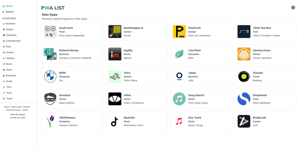 PWA List is a directory of PWA. You can find PWA by app name, category, or tag.