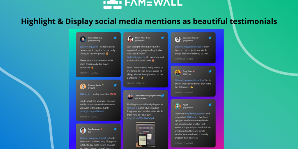 Famewall helps you highlight & display social media mentions from platforms like Twitter, Reddit as testimonials which can be embedded on your website 🔥Embed them in under 2 minutes 📜Testimonials coll