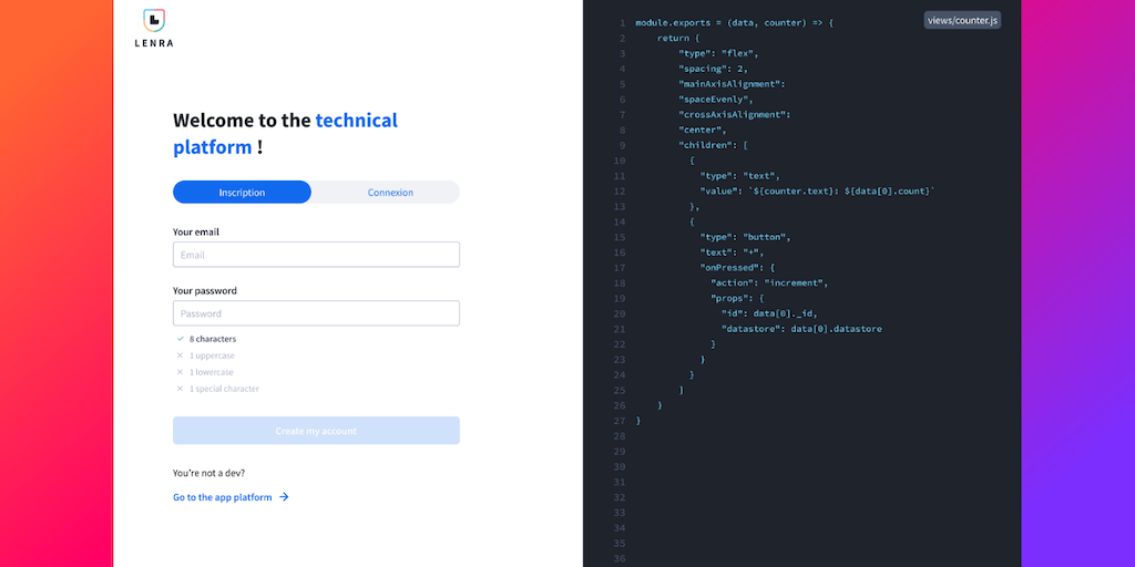 Lenra is a an open source backend framework to create an app using any language, and deploy it without any Ops scale. It's an alternative to big techs solutions, that offers you data protection, while