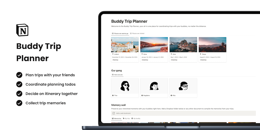 This buddy trip planner will help you remove hustle from your pre-travel planning with your friends. Plan your upcoming adventures together, assign todos, turn exciting activity ideas into a solid pla