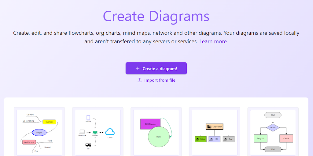 Use Diagrams to create and share flowcharts, mind maps, org charts, network, and other diagrams. The app saves your diagrams in the browser, which means your data stays on your device and is not sent