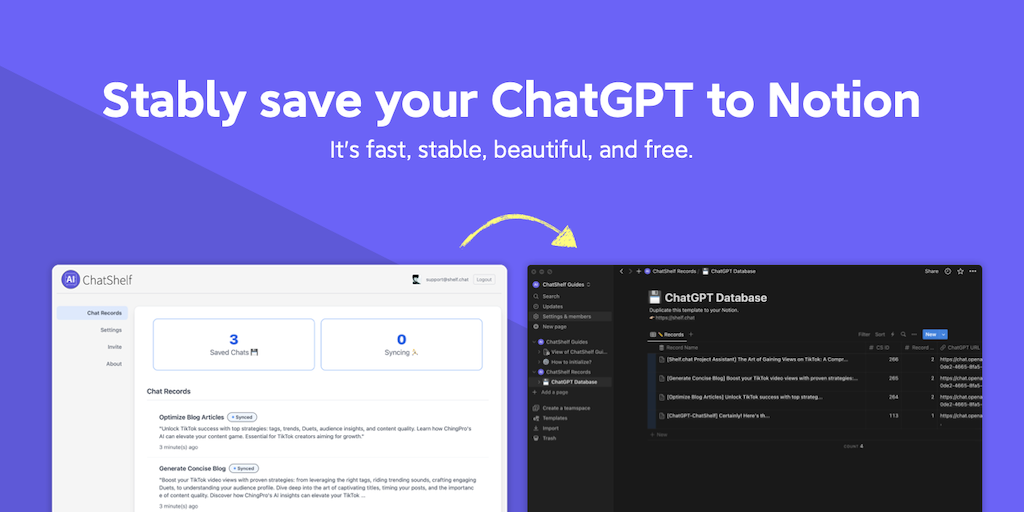 ChatShelf helps ChatGPT users save conversations to Notion. It's fast, stable, beautiful, free, and offers excellent support for Notion's text formatting.