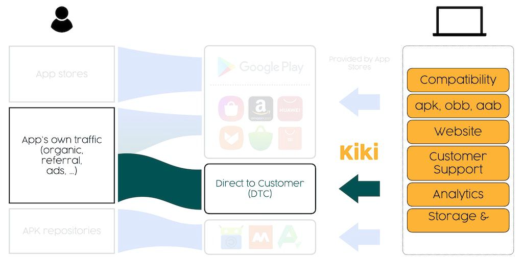 Kiki is an app-distribution SaaS, composed of an SDK to be integrated within the app, and a release management and monitoring panel, which facilitates publishing apps on websites and through direct li