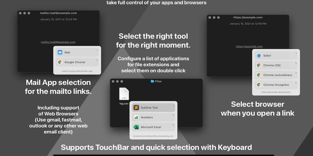 OpenIn helps you manage how links and files open on your Mac. For every link, you can select from multiple browsers, mail clients or apps for files, or configure based on where the file or link is ope