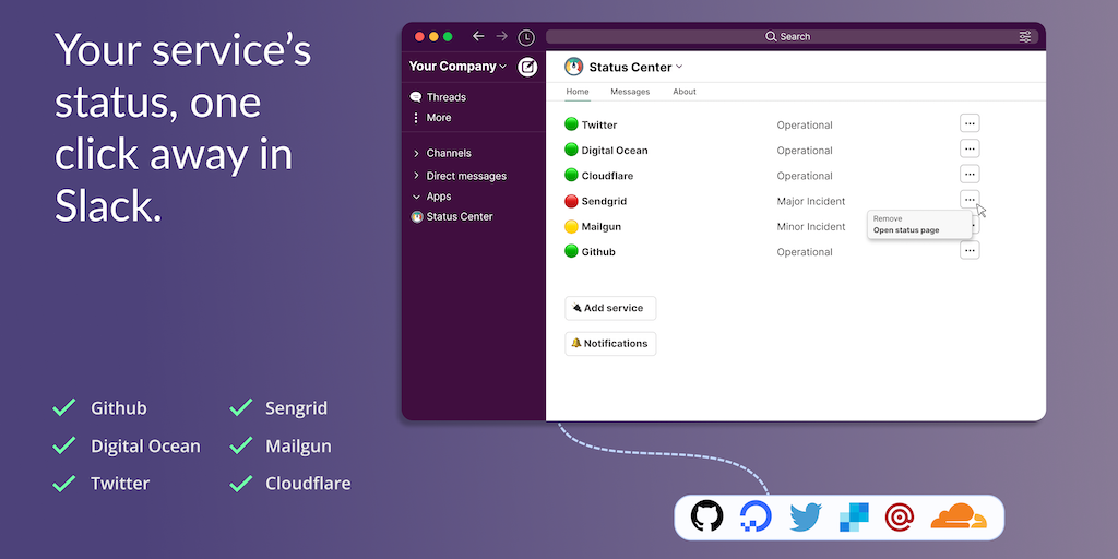 Is Github/AWS/Cloudflare down? Never ask this question again. Keep a customizable status dashboard one click away in your Slack workplace. Get real-time status updates on the services you and your tea