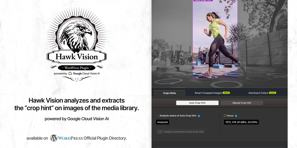 Hawk Vision plugin analyzes images in WordPress media library with Google Cloud Vision AI and extracts an important area (crop hint) of the image that contain the subject. And 2 add-ons that supplies