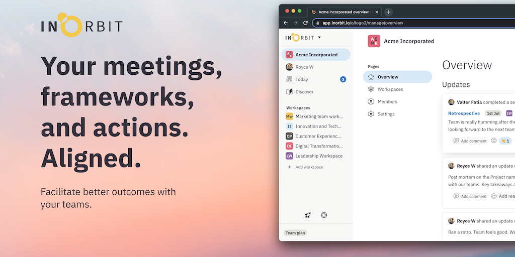 InOrbit is your all-in-one solution for organizing meetings, collaborating, and ensuring alignment. With frameworks and purpose-built sessions, InOrbit structures your team activities, seamlessly adds