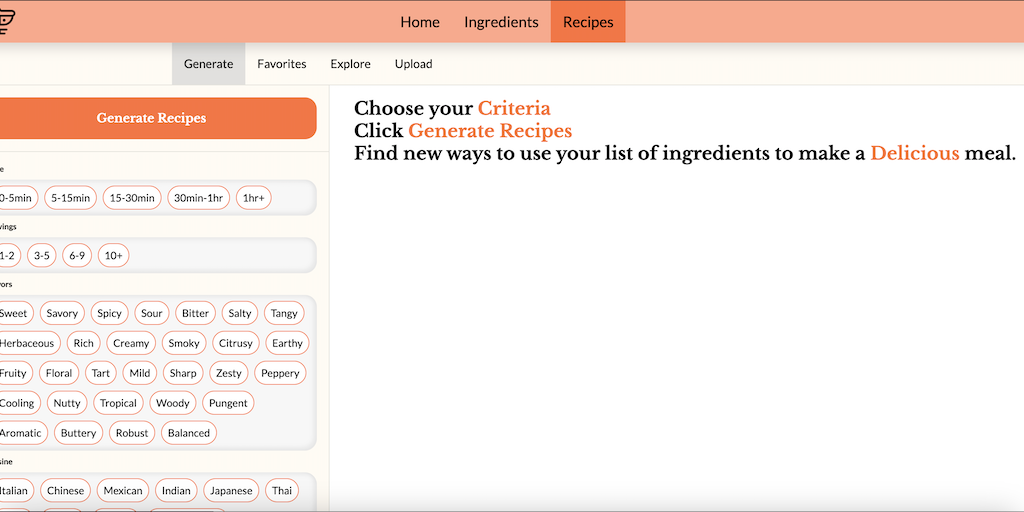 With the help of AI, users can easily generate new recipes based on their available ingredients, specific preferences such as serving size, flavor, meal type, and cuisine, creating a personalized and