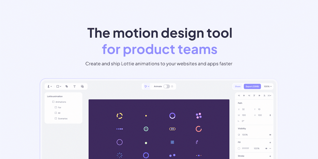 Create and export Lottie animations to your websites and apps easily! - Import SVGs, Lotties, from Figma or create from scratch - Animate with a simple but powerful timeline - Export as Lottie, Gif or