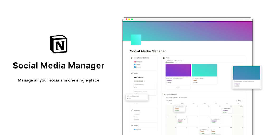 This template helps you manage all your social media platforms in one place with a lot of features.