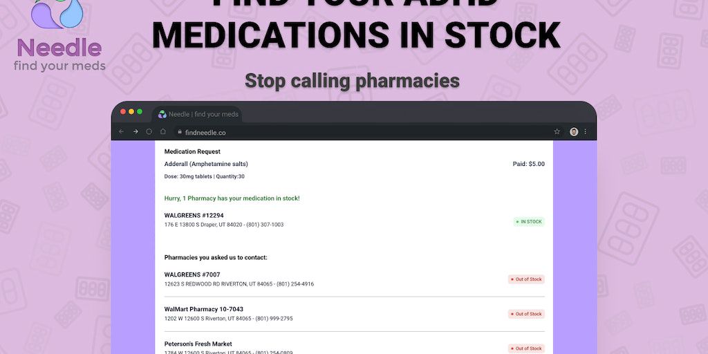 Needle: Find your ADHD medications in stock today! Stop calling pharmacies when Needle can do it for you. Use coupon code PRODUCTHUNT at checkout for 5 free pharmacy calls.