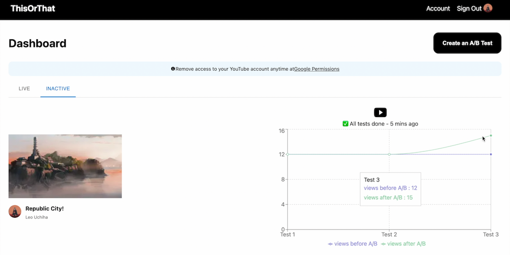 Often it's hard to predict which title or thumbnail creates the most engagement. People do judge a YouTube video by its title or thumbnail. ThisOrThat is a tool for YouTubers to A/B test the titles an
