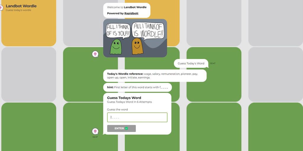 Landbot Wordle is a web-based conversational word game created and developed by Rapidbott team.