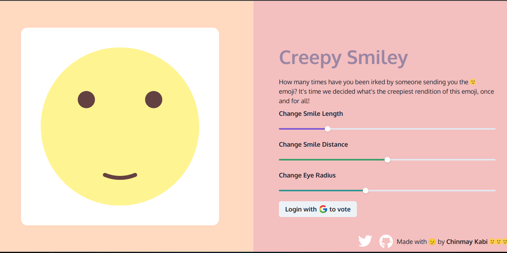 Do you get sick in your stomach when you see the 🙂 emoji? How much of that sly smile is creepy? Let's vote! The numbers for all the votes are crunched and the average creepy smiley is shown, simple 🙂