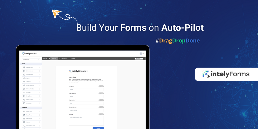 IntelyForms is an easy-to-use, no-code form building tool that allows you to easily build secure, integrated workflows. IntelyForms saves time and money while also increasing consumer engagement.