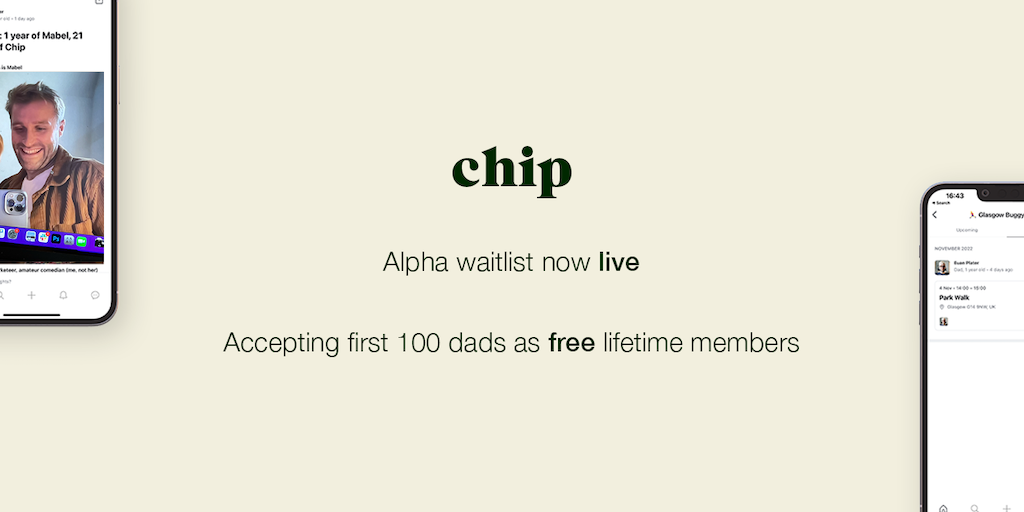 I wanted somewhere to chat with dads - that didn't exist when my daughter was born. The first 100 members will get Chip free for life when we launch our freemium product down the line. For now, let's