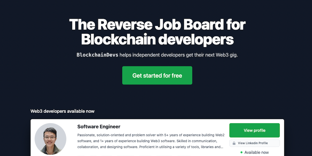 BlockchainDevs is a 2 sided hiring marketplace for Blockchain Developers. We helps independent developers get their next Web3 gig and help companies hire their next Blockchain engineer.