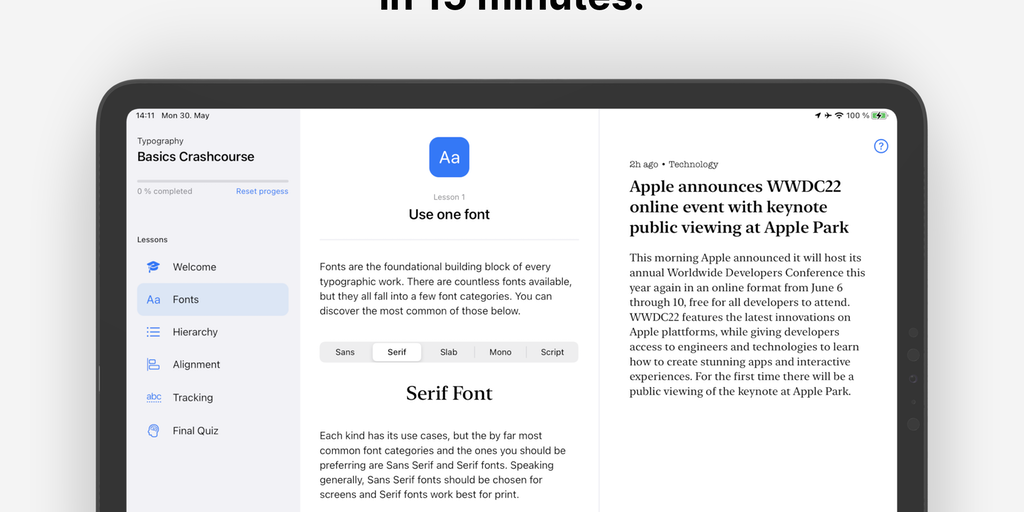 Learn the fundamentals of typography with Typoversity. Discover how good typesetting works in small bite-sized lessons and then apply what you have learned in interactive challenges. Made for iPad. Th