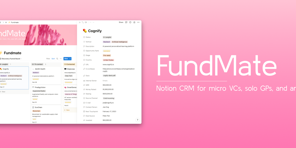 Introducing Fundmate, the simple and user-friendly Notion template for micro VCs, solo GPs, and angels to track & manage the startup dealflow and portfolio. Say goodbye to complex and confusing invest