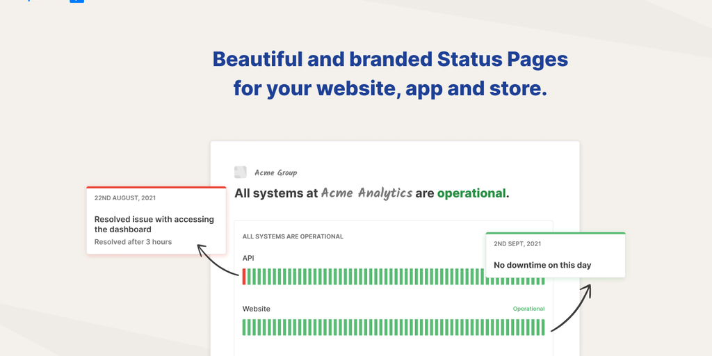 Create beautiful and branded Status Pages for your website, app and store. 🚀 Fast setup - create your branded status page in 2 minutes. Share real time updates about incidents and planned maintenances
