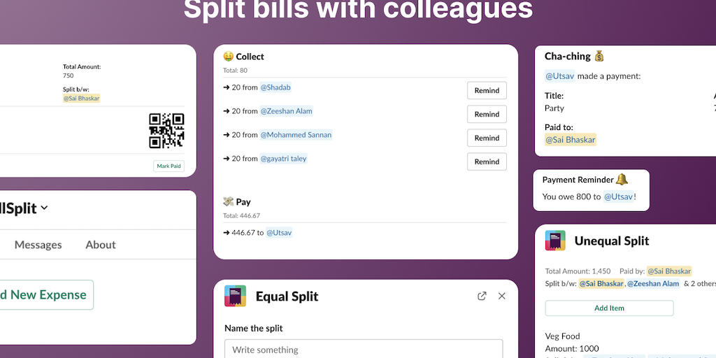 BillSplit is the easiest way to split & track bills between colleagues on Slack. You can split equally or unequally and track the amount you owe & you are owed in one place. Use it with your colleague