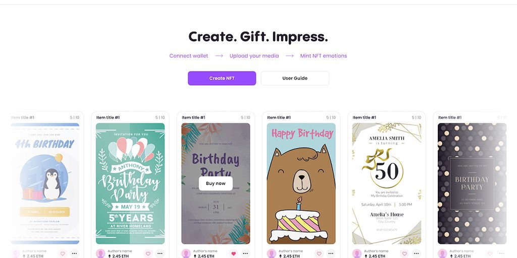 Collectible NFT postcards, greetings, and avatars for all occasions: Birthdays, Weddings, and Christmas. Explore NFTs created by users and professional artists. Create your own NFT greeting cards and