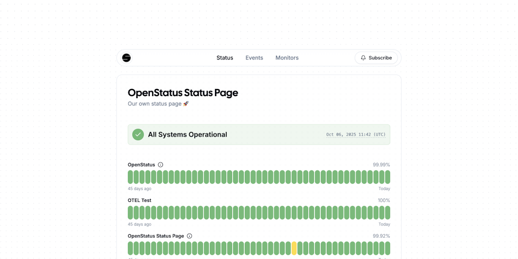 OpenStatus is an open-source uptime and synthetic monitoring platform. Monitor your API and website globally. Showcase your reliability with a public status page. Get started for free.