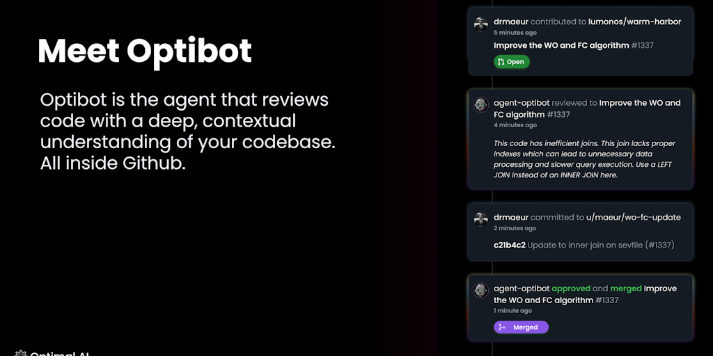 Meet Optibot, the AI agent that thinks, reviews, and maintains your codebase. It lives in GitHub, reviews PRs with judgment, fixes CI issues and keeps your code clean long after it's merged. Built by