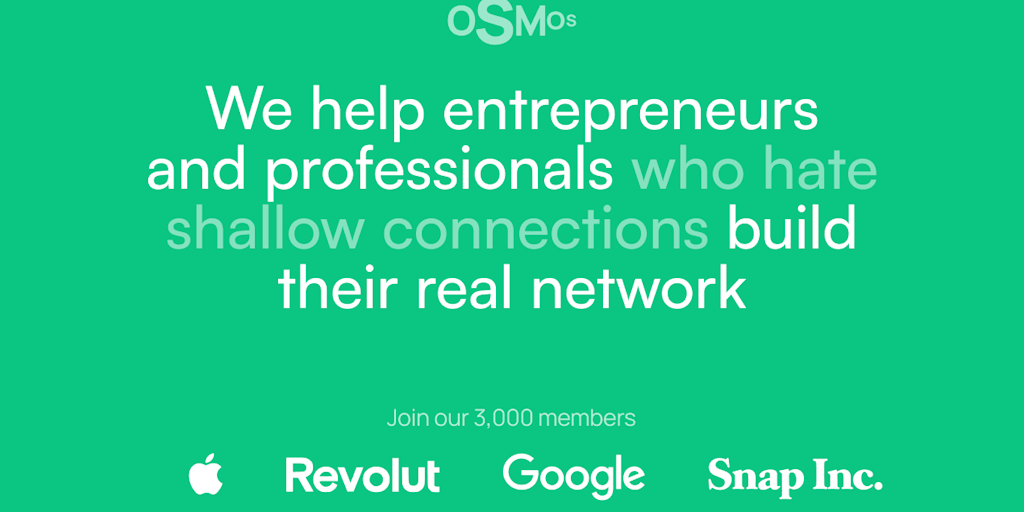 Osmos matches entrepreneurs and professionals for meaningful 1-on-1 conversations. Osmos helps you find like-minded peers, gain rare industry insights, and build a network that cares—no small talk, no