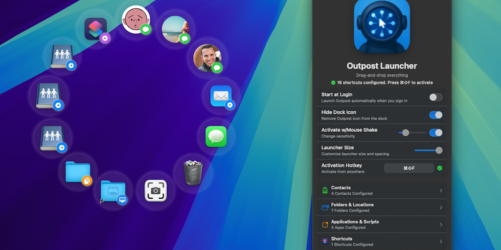 Outpost is your instant drag-and-launch companion for macOS. A cursor-centered palette for contacts, apps, folders, and custom actions — activated by hotkey or a quick shake of the mouse.