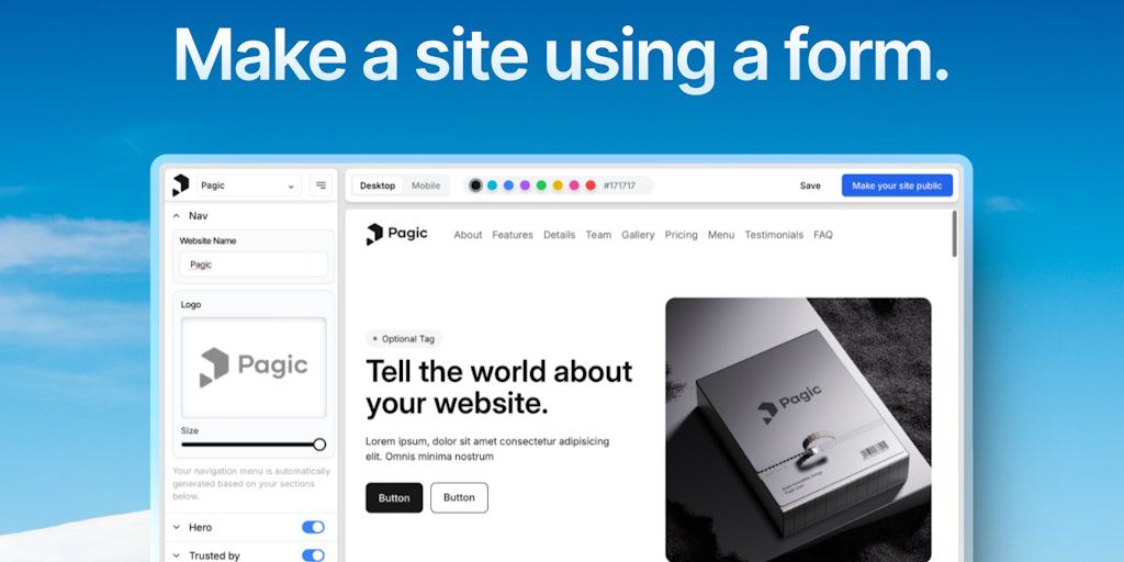 Pagic helps non-technical people make websites. Just fill out a form, and you'll have a clean, mobile-friendly site in minutes.