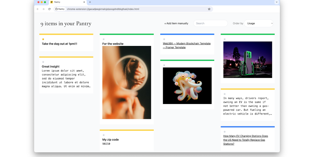 Pantry is a tool for saving and organizing content you find online. Effortlessly collect links, images, text in one convenient place. Pantry makes it easy to store and access your content whenever you