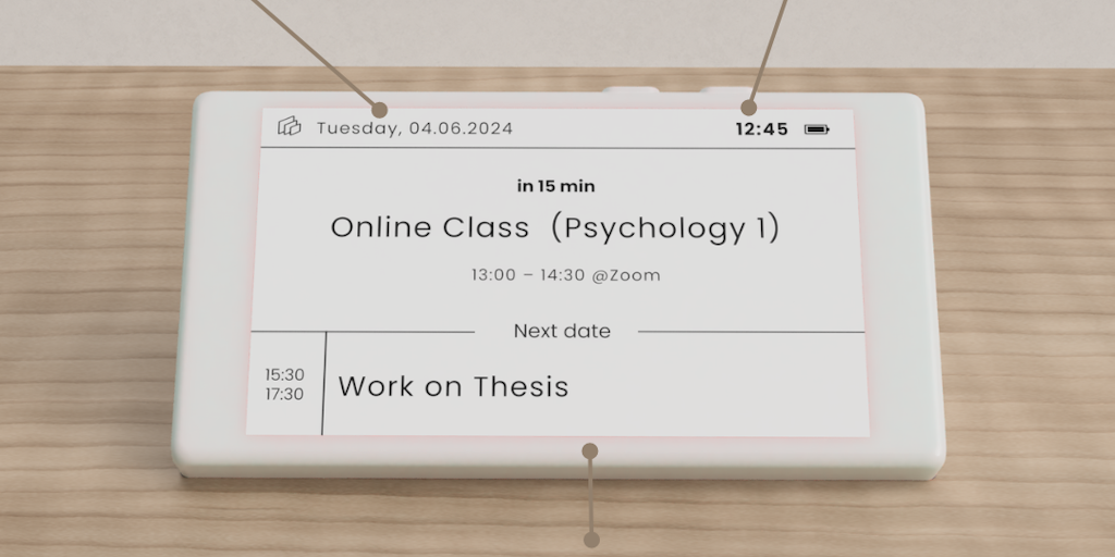 PaperSync brings your digital data permanently into your field of vision. Once linked to your preferred services, the wireless device automatically structures and visualizes the key points of your eve