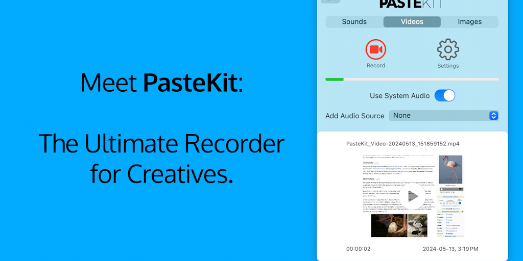 Modelled after the needs of video editors and content creators, PasteKit makes it blazing fast for you to capture and use what you see or hear on your Mac. Just capture and paste into your audio/video