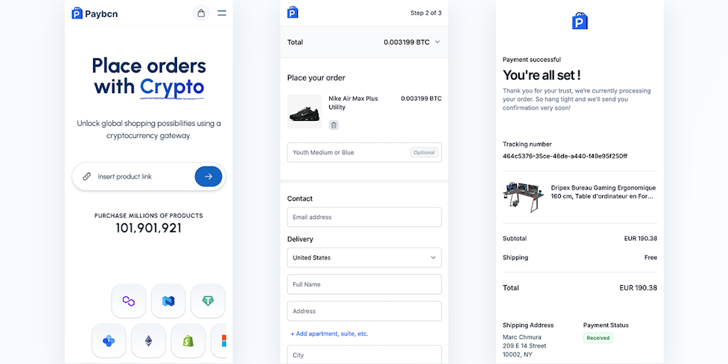 With Paybcn, you can shop millions of products with crypto. Avoid token conversions and profit taxation to simplify your portfolio management. Paste your product link, and hit the pay button. Paybcn w